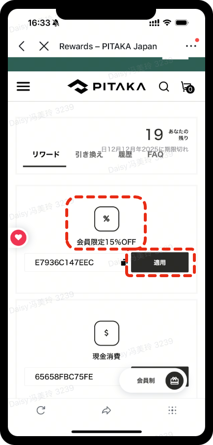 1 ポイントを使って、「リワードを獲得」欄内の「会員限定15%OFF」を交換できます。