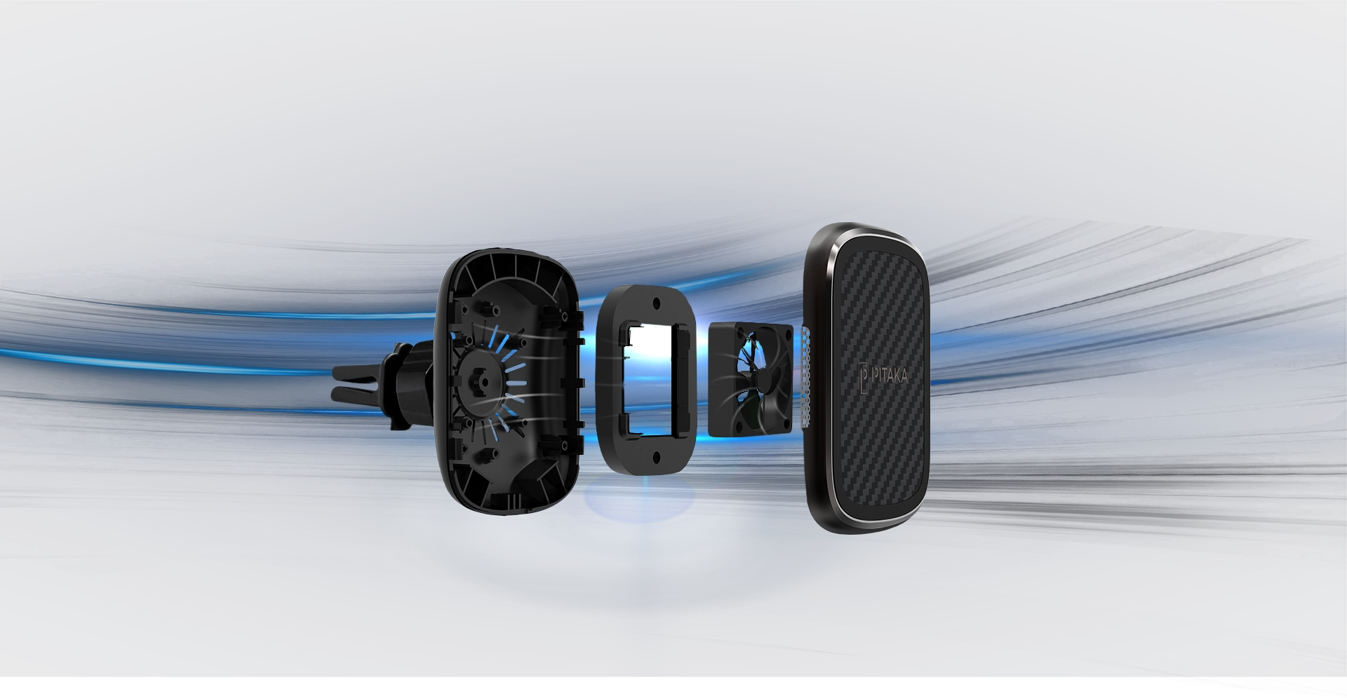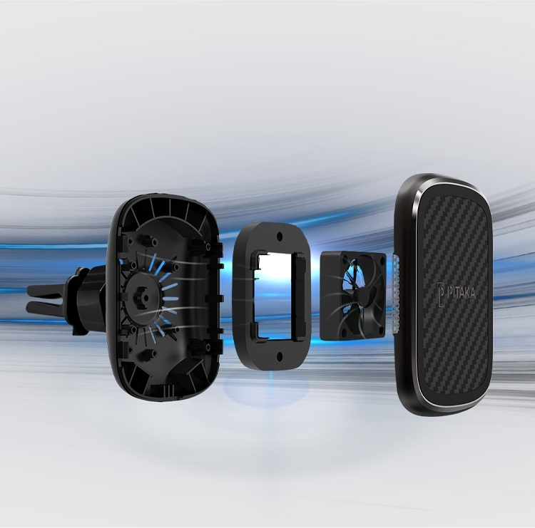 The built-in cooling fan reduces heat, increasing the MagEZ Mount Qi's charging power. The charger includes sensors that detect an increase in temperature, voltage, and current to protect your device and the MagEZ Mount Qi while driving.