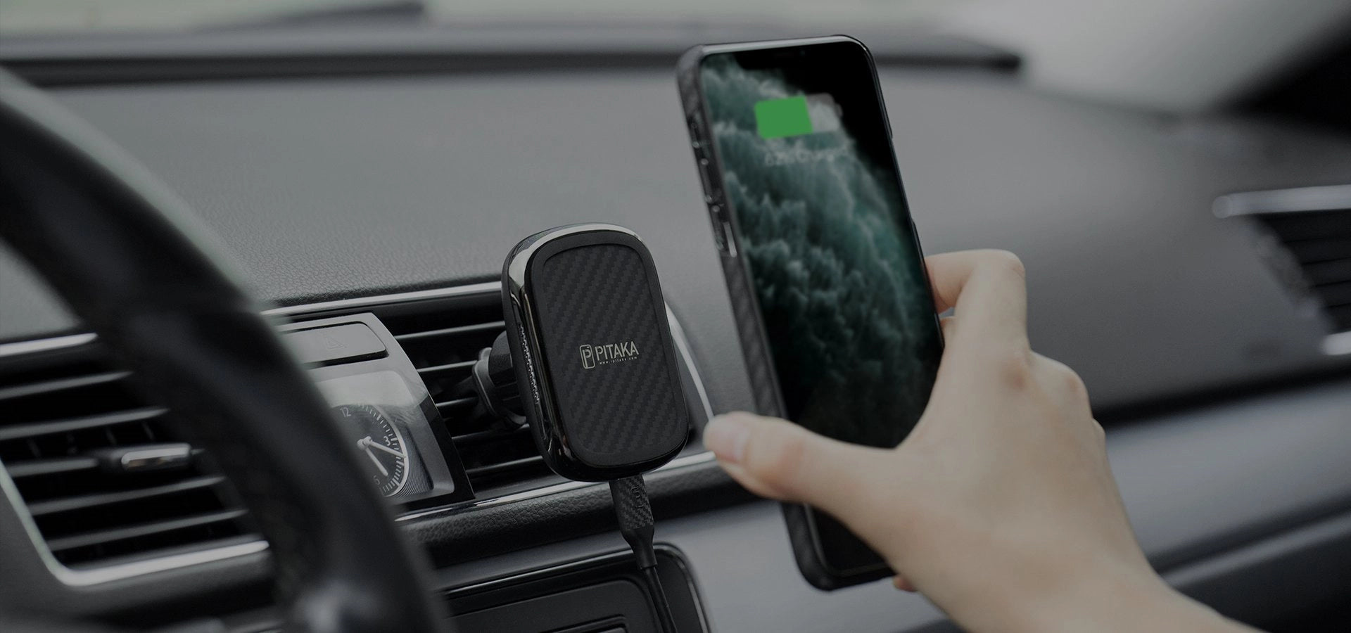 A magnetic wireless charging car phone mount that holds and charges your phone while driving.