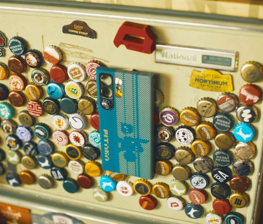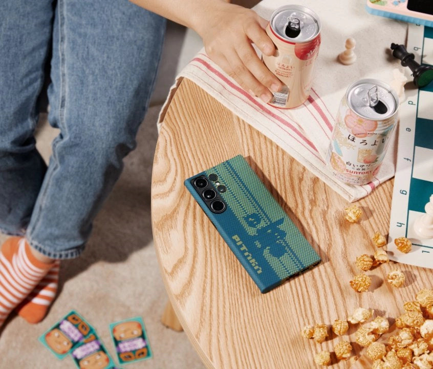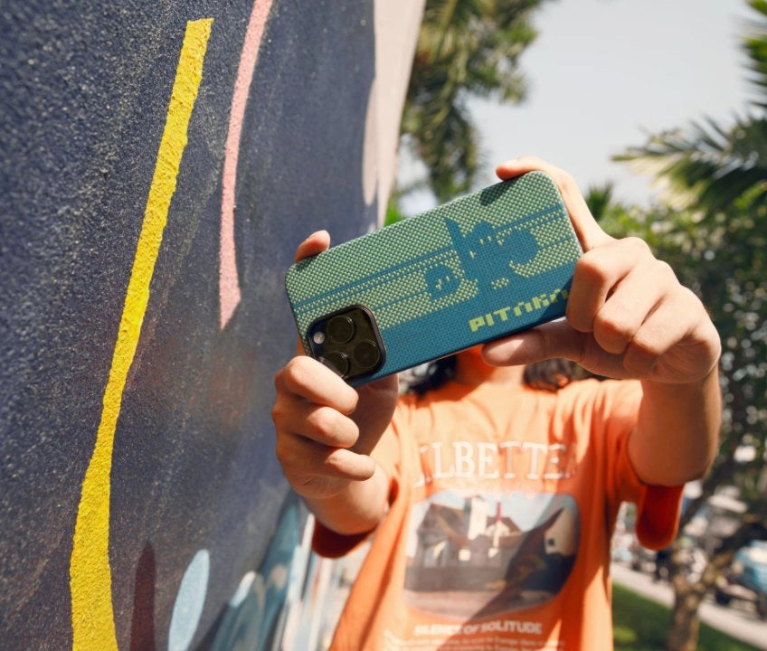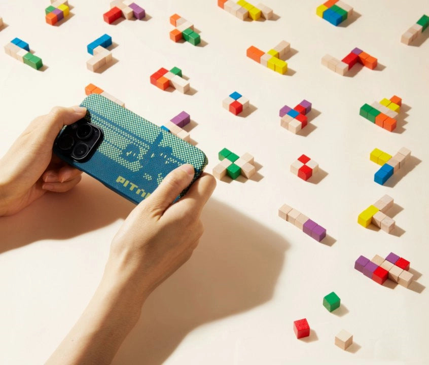 Pixel Gameケースの場合、内側の黒とグレーの綾織りアラミド繊維の生地、表面のジャカードでピクセル柄を表現した生地、中央の2層構造のMagSafeモジュールからなる4層構造になっています。表と裏の生地の色が異なり、柄のある生地の裏側には不規則な絹糸があるため、スマホケースの側面の角で縫い目を作ると、異なる色の糸が現れます。