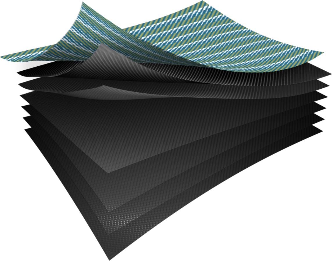 ChromaCarbon(クロマカーボン)は、カーボンファイバーの強度とアラミド繊維の弾力性をシームレスに融合させた革新的な複合積層技術です。特殊な樹脂を高温高圧で緻密に処理することで、さまざまな素材に比類なき耐久性と強靭性を実現します。また、独自の技術「浮織(うきおり)™」によって複雑で美しい模様を織り上げています。